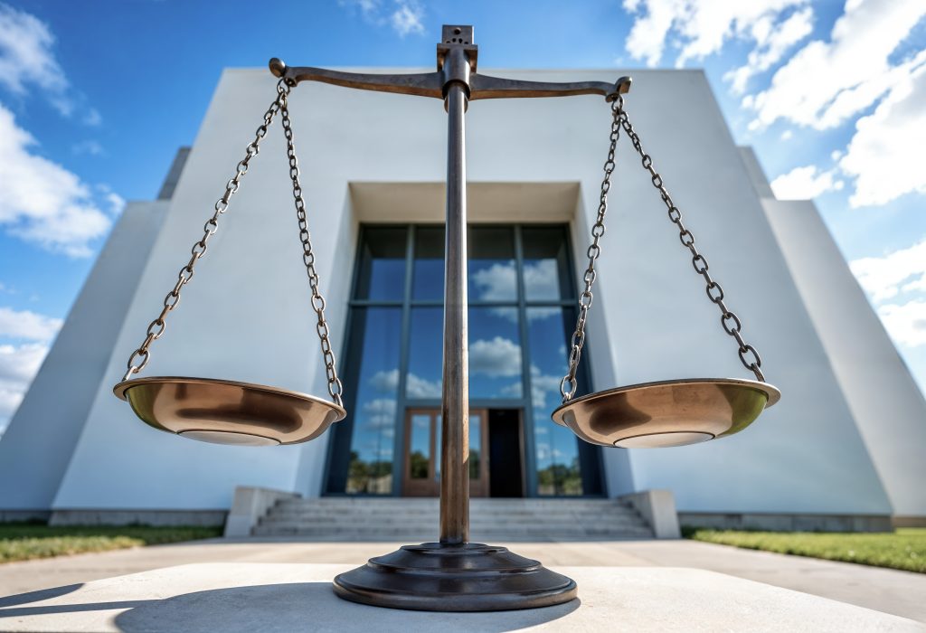 Bronze scales of justice standing before a modern white courthouse